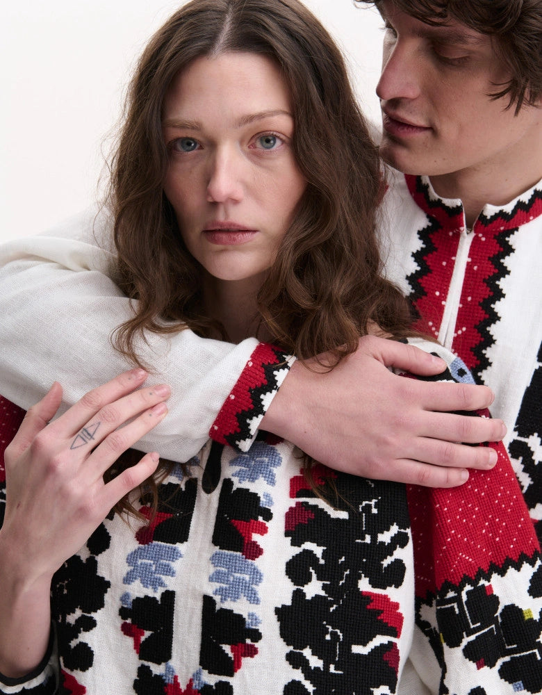 Embroidered pattern is a cultural talisman, a carrier of ancestral memory. Every piece requires an average of 6,000 meters of thread and several weeks of hand embroidery, using traditional techniques including "pykhlyky," "zbyranky," tassels, and decorative seams.